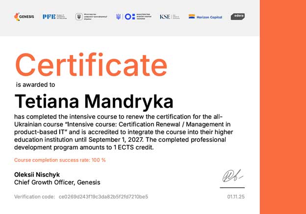 ВИКЛАДАЧКА ЦИКЛОВОЇ КОМІСІЇ ПРОГРАМНОЇ ІНЖЕНЕРІЇ ПРОЙШЛА ЩОРІЧНЕ ПІДВИЩЕННЯ КВАЛІФІКАЦІЇ ДЛЯ СЕРТИФІКОВАНИХ ВИКЛАДАЧІВ ВСЕУКРАЇНСЬКИХ КУРСІВ ВІД GENESIS