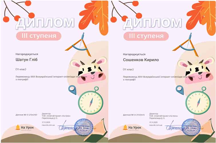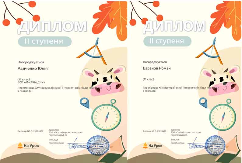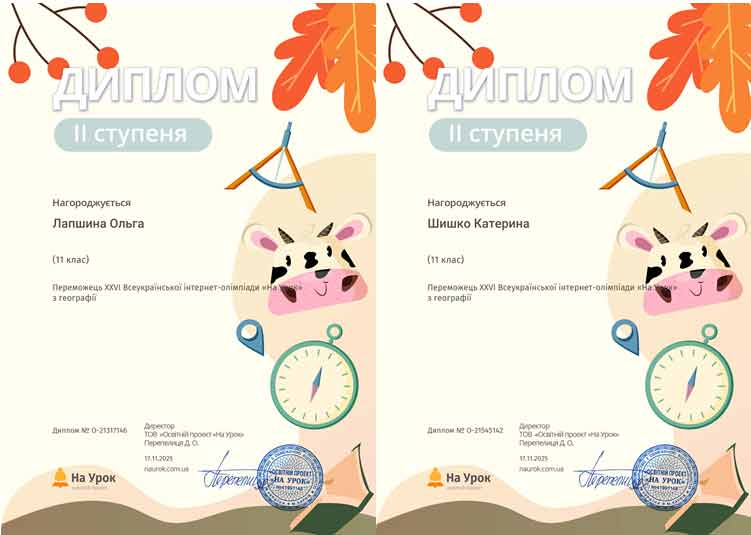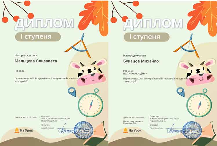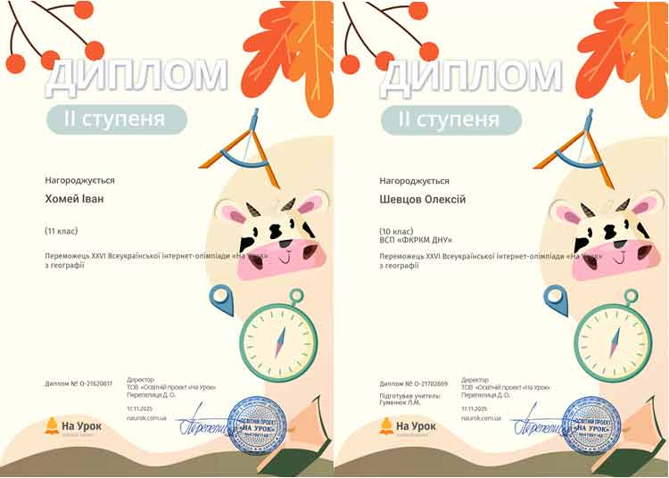 Студенти ІІ курсу груп ЕП-24-1, ПЗ-24-1 та ПЗ-24-2 прийняли участь в XXVІ Всеукраїнській інтернет-олімпіаді «На Урок» з географії і здобули 3 дипломи першого ступеня, 6 дипломів ІІ ступеня та 5 дипломів ІІІ ступеня. Відповідальний за проведення олімпіади викладач Гуменюк Л.М.